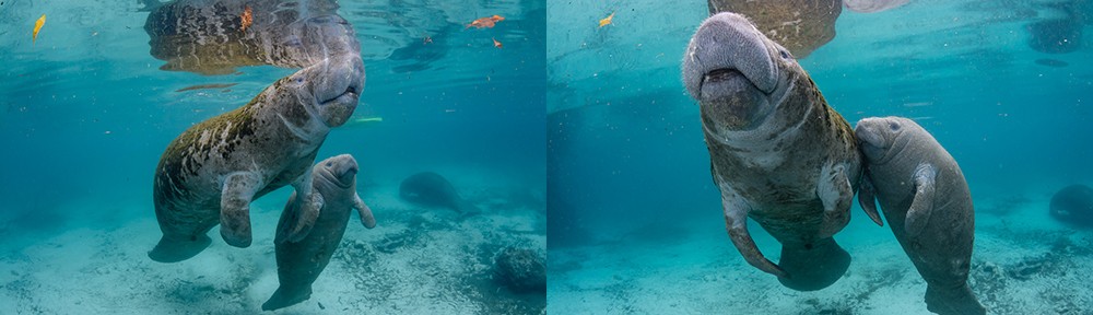 Feb 23 2015 ID shot of skinny mother and her young male calf. Even though she has lots of algae, distinct markings like a tail notch on the right help determine ID. Three Sisters Springs, Crystal River, Florida.